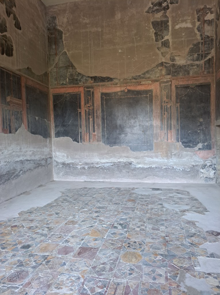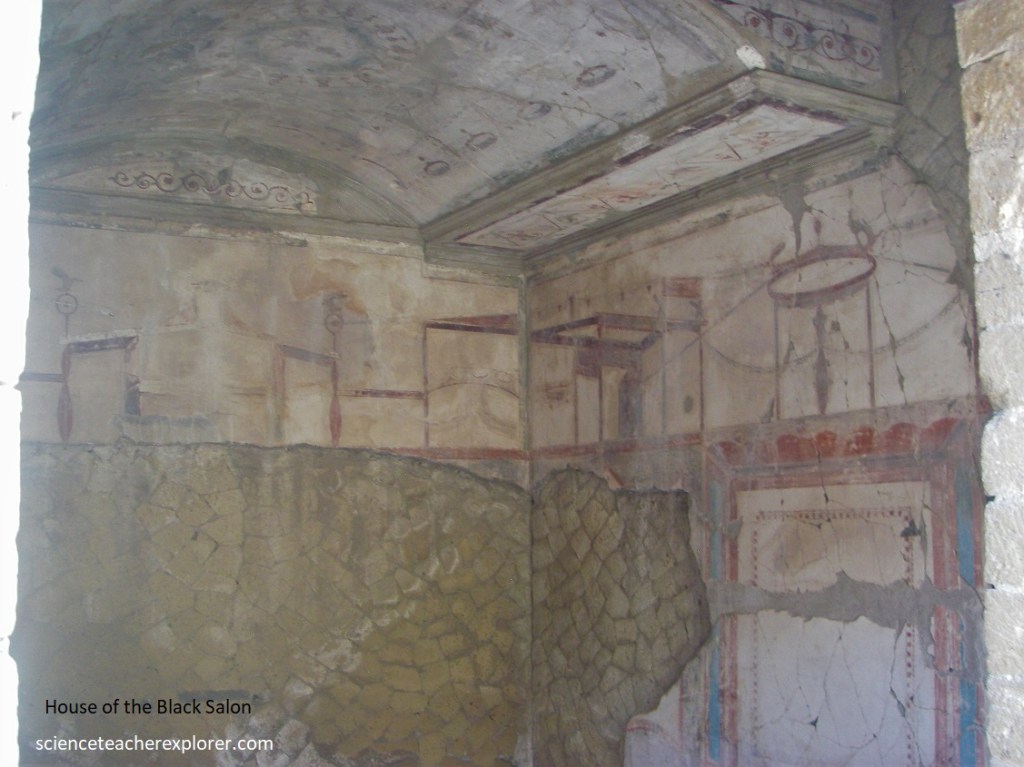 Pictured above, an entrance next to the Thermopolium near the Forum, brought us to the atrium of the ‘House of the Black Salon’ (Casa del salone nero). Through the entrance vestibule, we entered the atrium with a central marble pool and limestone puteal, paved in cocciopesto with inserts of rows of mosaic tesserae. Facing onto the atrium to the right were two cubicula and a kitchen. At the back of the atrium was the large tablinum, paved in cocciopesto with inserts of marble pieces with a corridor alongside. To the left are another cubiculum and a living-room, giving access to a more spacious rectangular room, opening towards the peristyle, (pictured below).