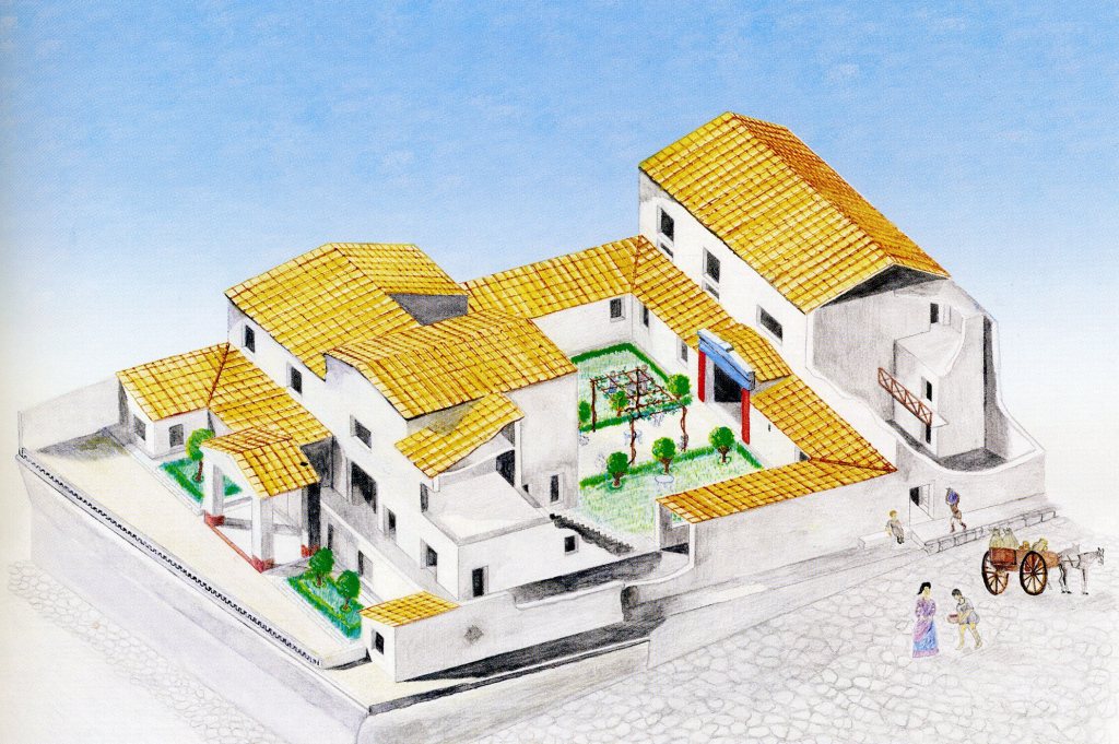 Pictured below, the Tuscan-style atrium had a Central alluvium or home pool for collecting rainwater. The walls of the atrium were decorated with frescoes with large red and black panels framed in light red, and the floor was covered with mosaics in the opus Signum style.