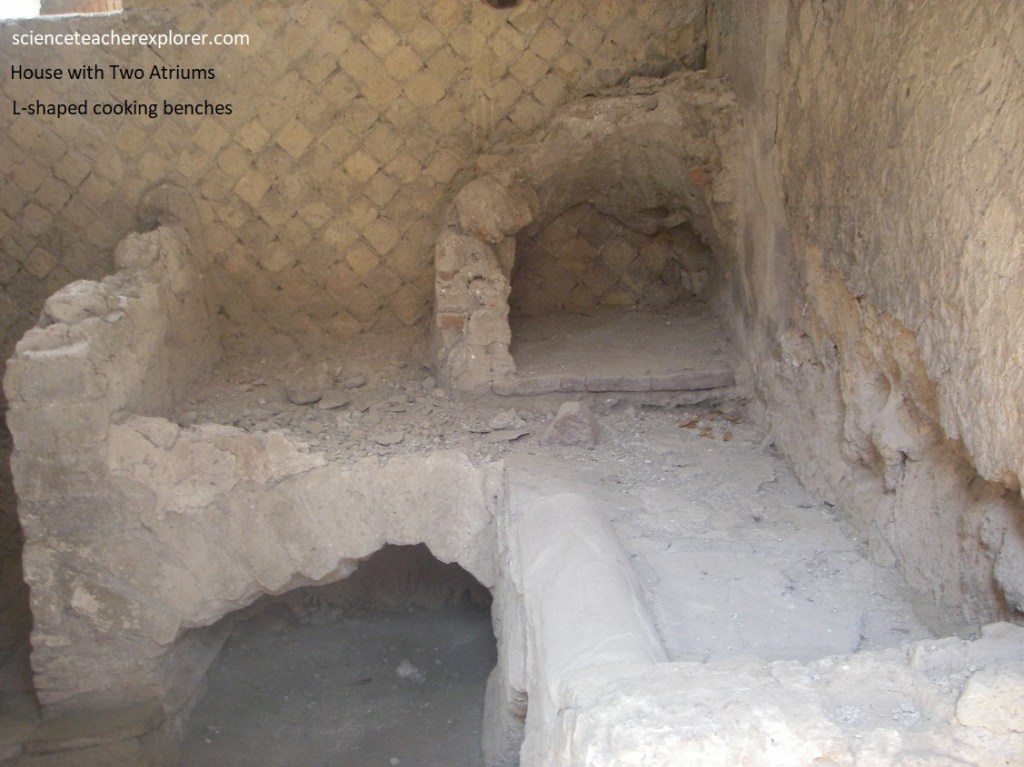 Pictured above, to the right of the atrium mentioned above, was a kitchen with an L-shaped cooking surface and a hole in the corner which served as a latrine.