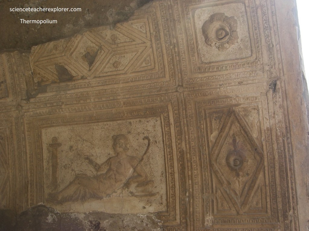 The soffits of the arch at the entrance of Decumanus Maximus, and the interior of the vault were decorated with precious relief stuccoes with plastic caissons. Becky and I admired a panel showing a young satyr reclining with a shepherd’s crook, (pictured above).