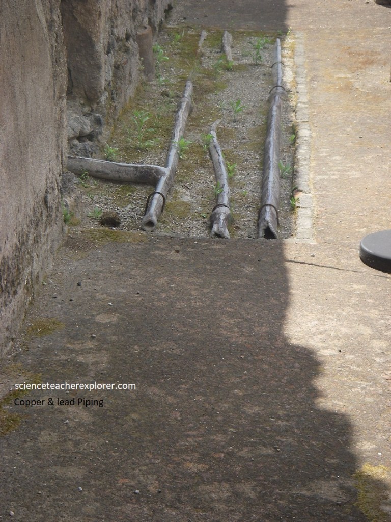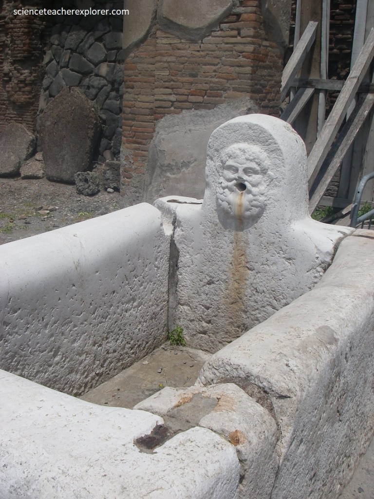 At the corner between the Decumanus Maximus and Cardo V is a public fountain, decorated with he head of Neptune framed by 2 dophins. Alongside was a brick pillar with a recess still bearing part of a lead pipe, a castellum aquae, which enabled the regulation of the pressure, flow and distribution of the water from the Augustan aqueduct of Serino. Becky and I continued exploring down Cardo V, (pictured below).
