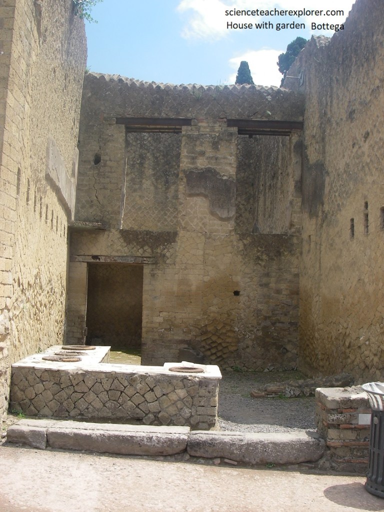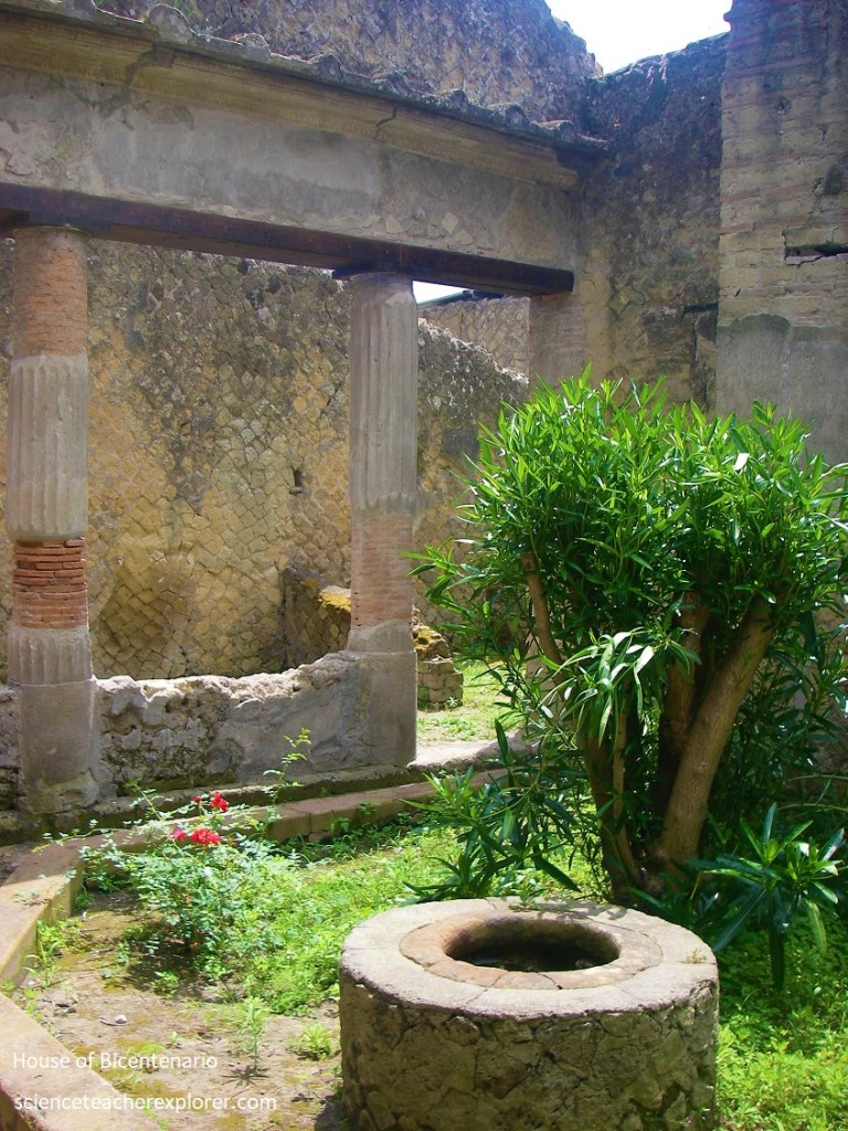 In the very back of the ‘House of Bicentenario’, we found the small peristyle, (pictured above), enclosing a garden in which rose-bushes were discovered. Set around this are 2 spacious oeci and the kitchen with latrine.