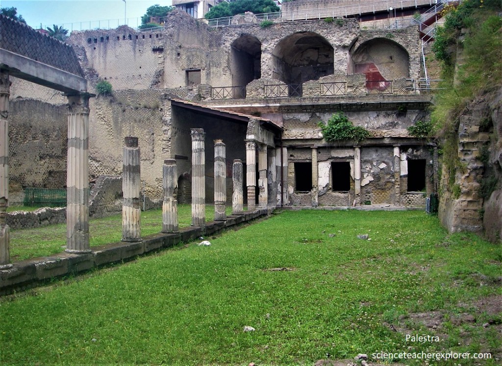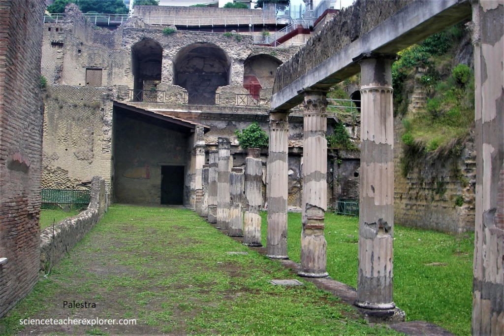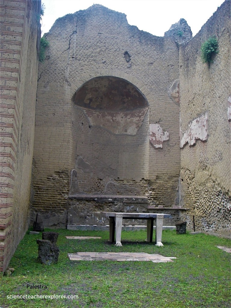 Back outside, Becky and I continued downhill (east) along the Decumanus Interior to the intersection, then straight ahead for a block into the vestibule of the ‘Palaestra’ (sports complex). The vestibule gave access to a large area (60 x 78m) porticoed on three sides (while on the north side was a cryptoporticus, illuminated by large windows, with annexed rooms), set in the shade of plane trees.