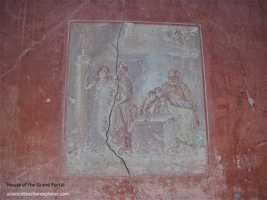 As Becky and I reached the corner of Decumanus Interior, we stopped to take a picture of the “House of the Painted Papyrus” (Casa del papiro depinto) from the street corner. This was a modest dwelling, which again conserved the dimension of the residential lot of the original Oscan urban layout. It is named after a fresco, not lost, which showed a papyrus scroll with the Greek name, Eutychos and two ink stands, one complete with pen.