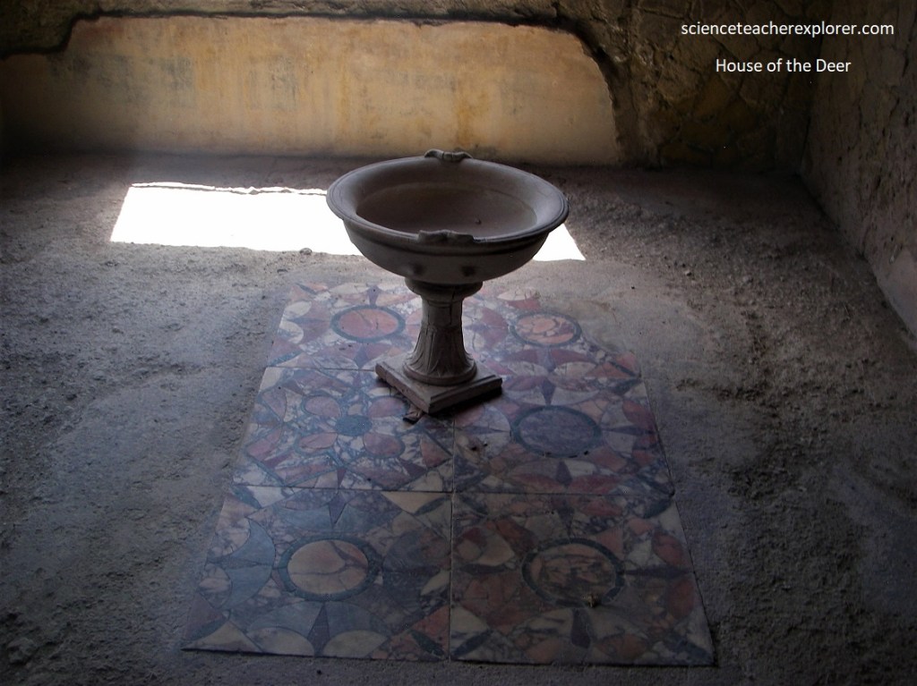 Pictured below, the pavement of the vestibule, which forms a single mosaic whole with that of the atrium, is of white-black mosaic in squares of interwoven bands with varied motifs. The floor of the atrium is undulated as a result of the subsidence cause by the volcanic material. The marble pool in the center is bordered with a triple black band and a rectangular frame with vegetable motifs.