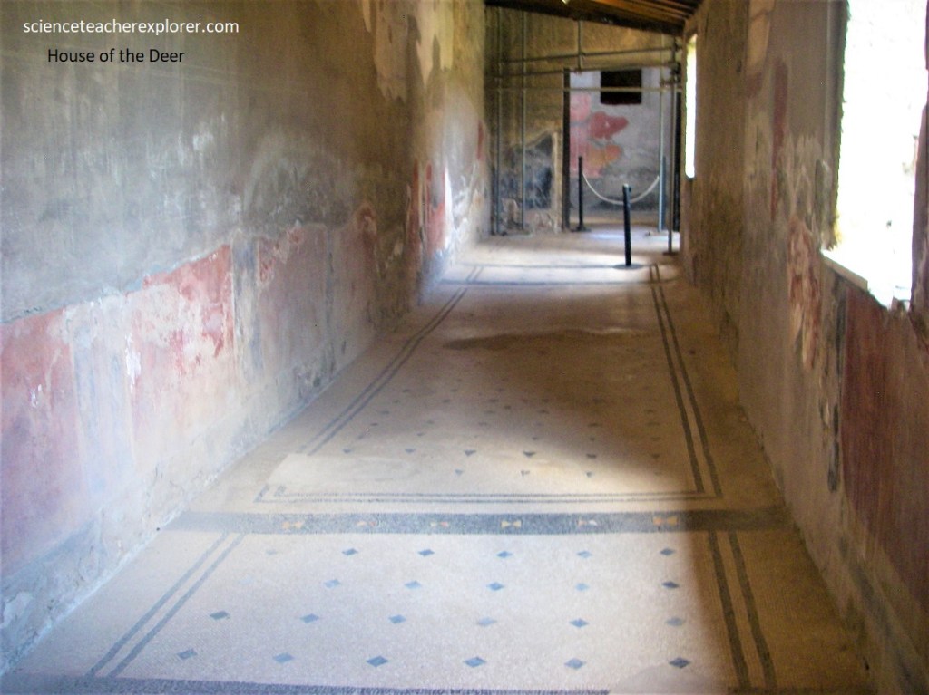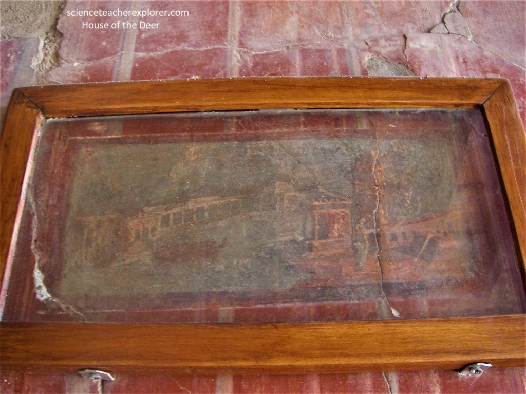 Becky and I strolled through the lower part of Cardo V, when we entered the ‘House of the Deer’ (Casa dei Cervi) on the right. This two-story building was the grandest of all Herculaneum’s mansions, with remarkable frescoes and what must once have been a superb garden kissed by sea breezes. The house was the finest example of the successful transformation of the traditional atrium house into a monumental edifice, influenced by the architecture of the grand seaside villas, built as it is on an axis designed to give the best possible exposure towards the superb panorama over the Gulf of Naples.