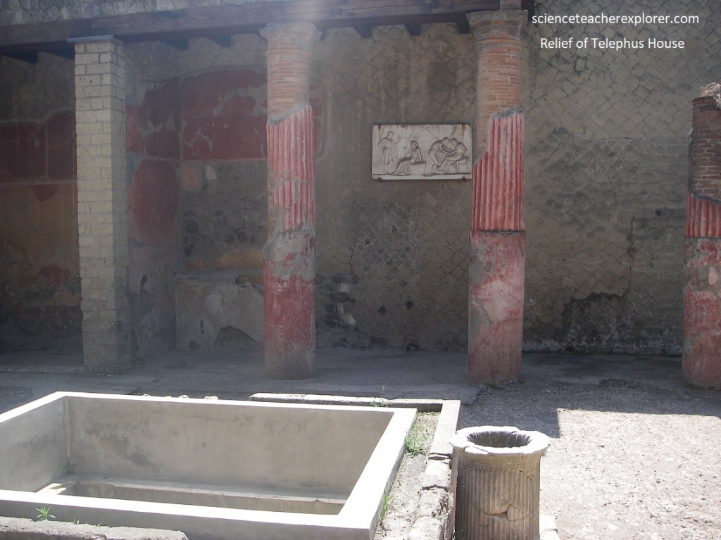 Pictured above, the atrium of the ‘House with the Relief of Telephus’, featured a simple wall decoration on a red ground. The pool of the impluvium was transformed into a flower bed. To one side is a marble puteal.