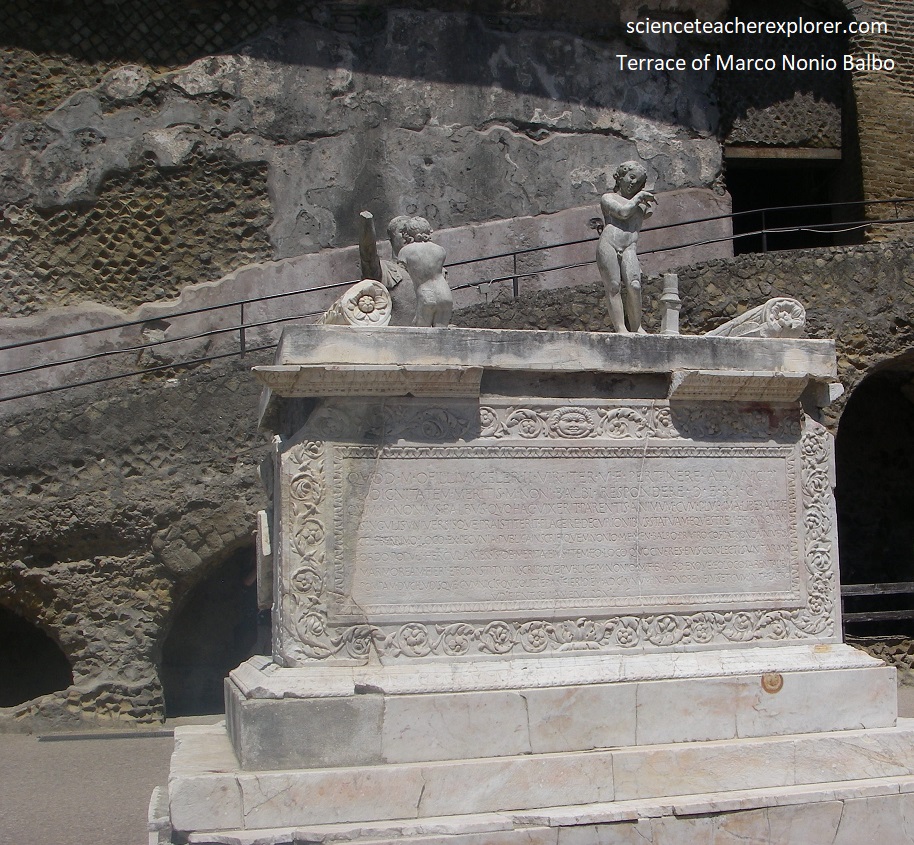 Pictured above, the funeral monument was completed by 2 beautiful sleeping in infants, holding torches head downwards. Behind the altar, on another marble base, was the heroic statue of M. Nonius Balbus in armor, set up by his freedman M. Nonius Volusianus.