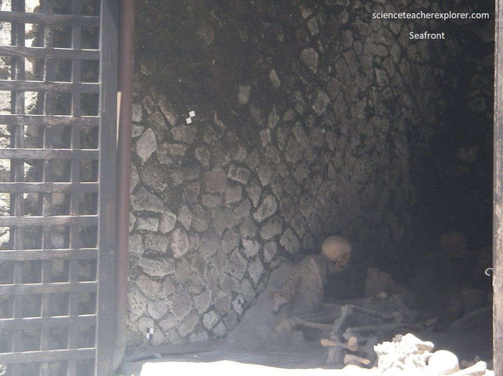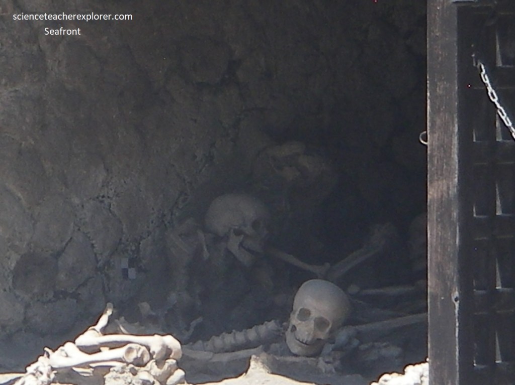 From the analysis of the Herculaneum skeletons, it emerges that there were more men than woman. The first surge was that which killed the Herculaneans found in the ‘Fornici’. Very recent studies have estimated the heat of the surge as 5000C on the basis of the horrifying effects observed on the skeletons of the victims, such as the explosion of the cranium as a result of the instant volatilisation of the cerebral tissue.