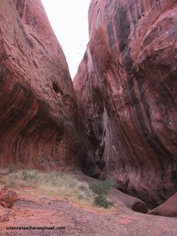 Pictured above, Forty-Mile Gulch gets very narrow within the Navajo Sandstone, below the falls. Until about 190 million years ago, the largest of these deserts was the environment where the Navajo Sandstone formation developed. A few tens of millions of years later, another enormous sand sea rolled across the Southwest, creating the Entrada Formation.