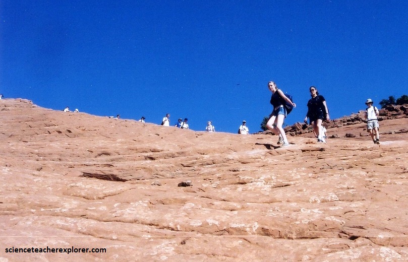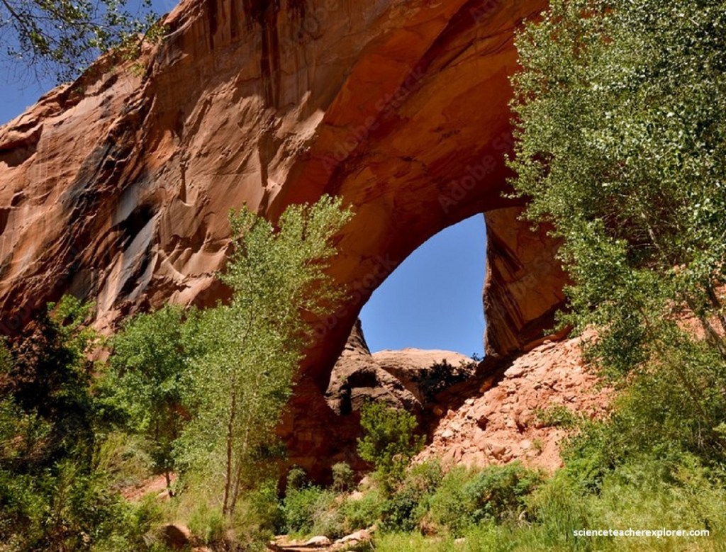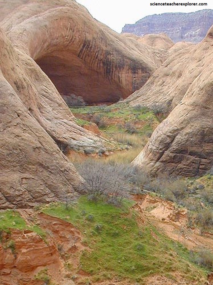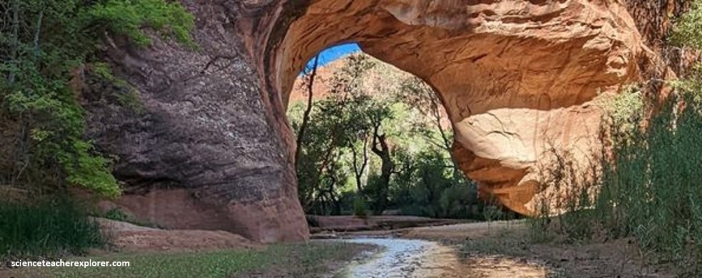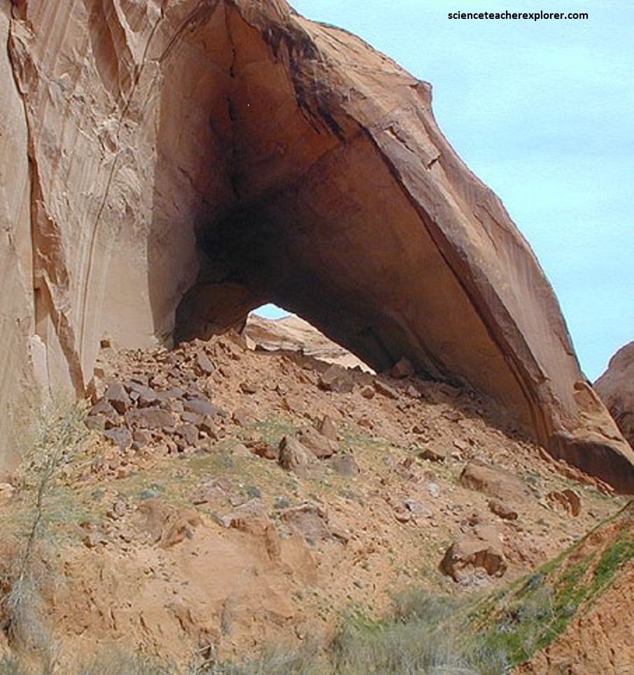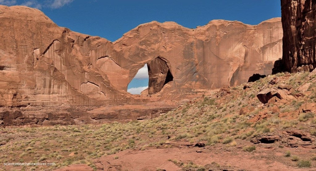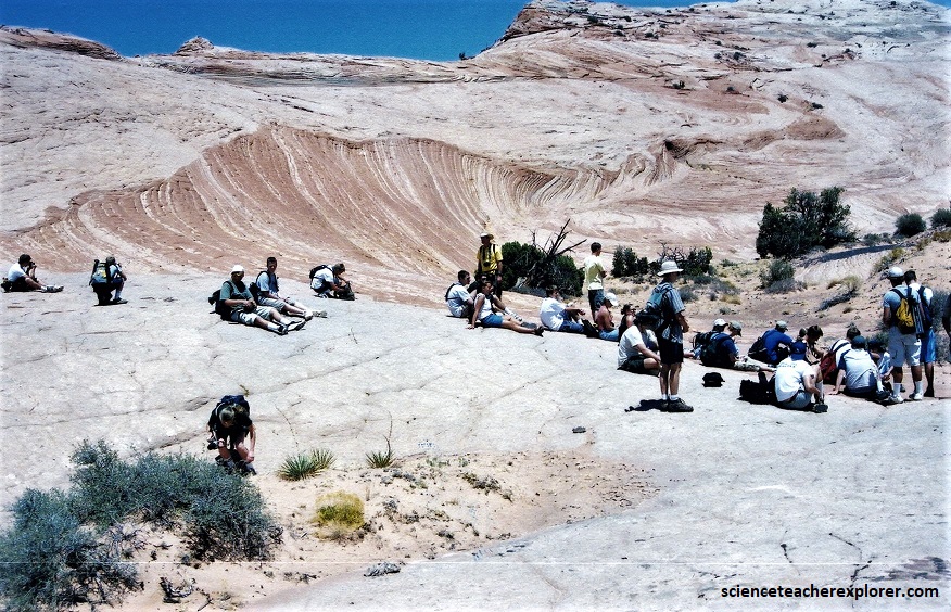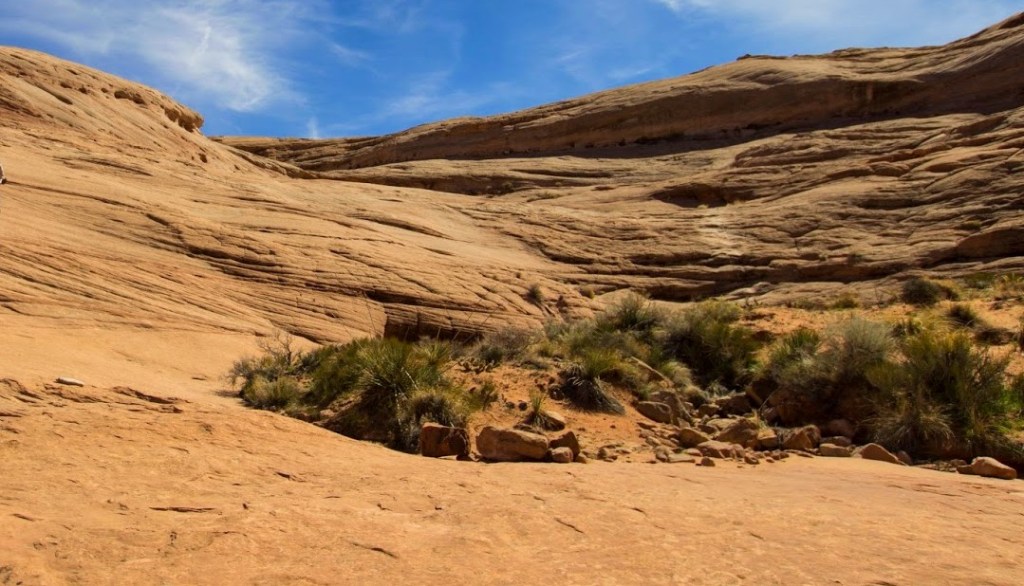 Sedimentary rocks from those long-ago deserts hold many clues about the environmental conditions of the time. The unstable dune fields were largely devoid of life, but around the margins of the dunes, dinosaurs once wandered. Today, occasional sandy hollows where cactus have gained a foothold interrupt the vast expanses of bare rock. At the junction of Willow Creek, our group turned upstream and after 1.5 km we came to Broken Bow Arch, (pictured below).