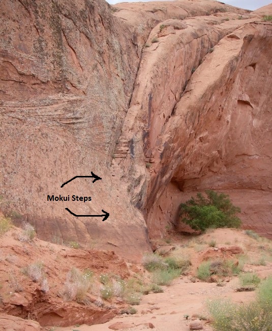 Pictured below, about 150 meters down-canyon from the parking lot, where ew reached the bottom is the beginning of “Peek-a-boo” Gulch. There were some “moki steps” cut in the rock and a log-placed, got us into the lower end.