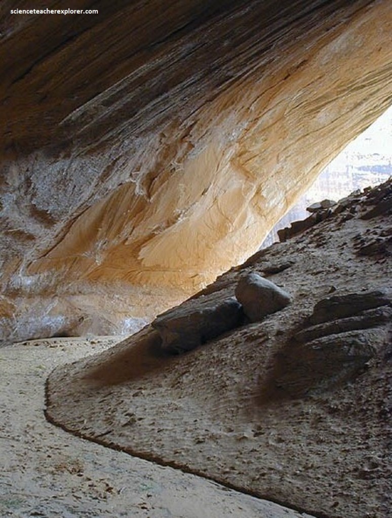 The Navajo is a light-colored, fine- to medium grained, massive sandstone. As mentioned above, it displays an elaborate array of high-angle cross-beds and forms cliffs, domes, monuments, and other bizarre erosional forms. The light coloration of the Navajo has been described with almost every color; white, tan, buff, salmon, pink, vermilion, brown, red, yellow, cream, orange, and gray. Hematitic (iron oxide) cement produces the red colors, limonite the yellows, and ferrous iron minerals the browns and local greens. Most of the grains are sub-rounded to well rounded, well sorted, frosted, and quartzose. Much of the Navajo is lightly cemented and friable, producing sand at the bottom of gulches like Coyote Gulch. Below the Navajo Sandstone and older is the Keyenta Formation. Here in Coyote Gulch, the Keyenta Formation intertongues with the