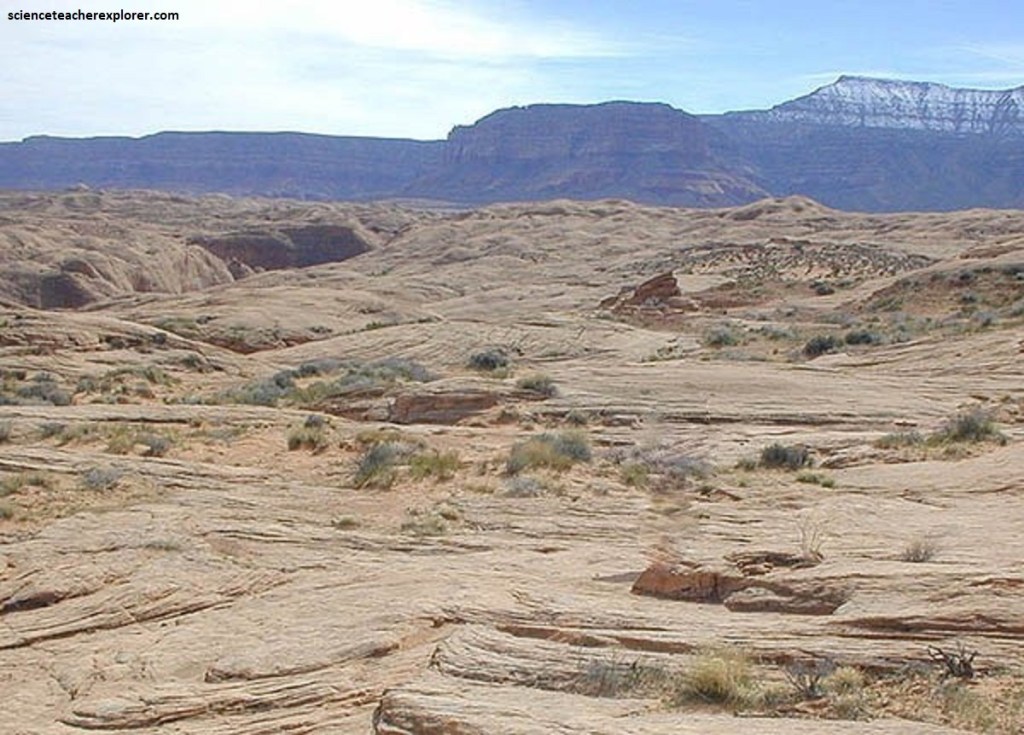 A Sahara-like desert extended across what is now the Southwestern US, including the Escalante region, beginning during the Jurassic roughly 200 million years ago. It was a time of extremely hot, dry, and windy weather. The combination of arid conditions, strong winds, and an abundant supply of sand created an enormous desert of sand-dunes. Over the eons of being blown around this Jurassic desert, the sand grains became rounded, frosted, and of roughly the same fine-grained sizes. The Navajo Sandstone formed when the particles were slowly cemented together by silica (silicon dioxide or iron oxide) and other minerals that moved through the sediments in groundwater.