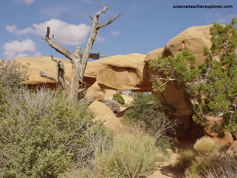 The features at Devil’s Garden are formed along the contact of the Gunsight Butte and Cannonville Members of the Entrada Sandstone. The natural arches and other formations were created, and continue to be shaped, by the natural processes of weathering and erosion.