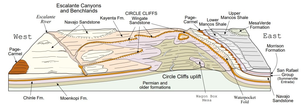 The dominant structural feature of the Escalante Canyons section is the Circle Cliffs uplift. It has a gentle southwest limb that extends from the Hole-in-the-Rock Road east-northeast to the axis of the uplift. The east limb of the uplift is the Waterpocket Fold, another steeply dipping monocline like the East Kaibab monocline. The Waterpocket Fold, however, is in Capitol Reef National Park. The core of the Circle Cliffs uplift is lined by the prominent vertical and magnificent red-brown or orange-brown cliffs of the Wingate Sandstone. These cliffs “circle” the uplift and are the basis for its name. The core of the uplift exposes Permian and Triassic rocks. The Escalante monocline is a north-northwest-trending feature north of the town of Escalante that dips to the west.