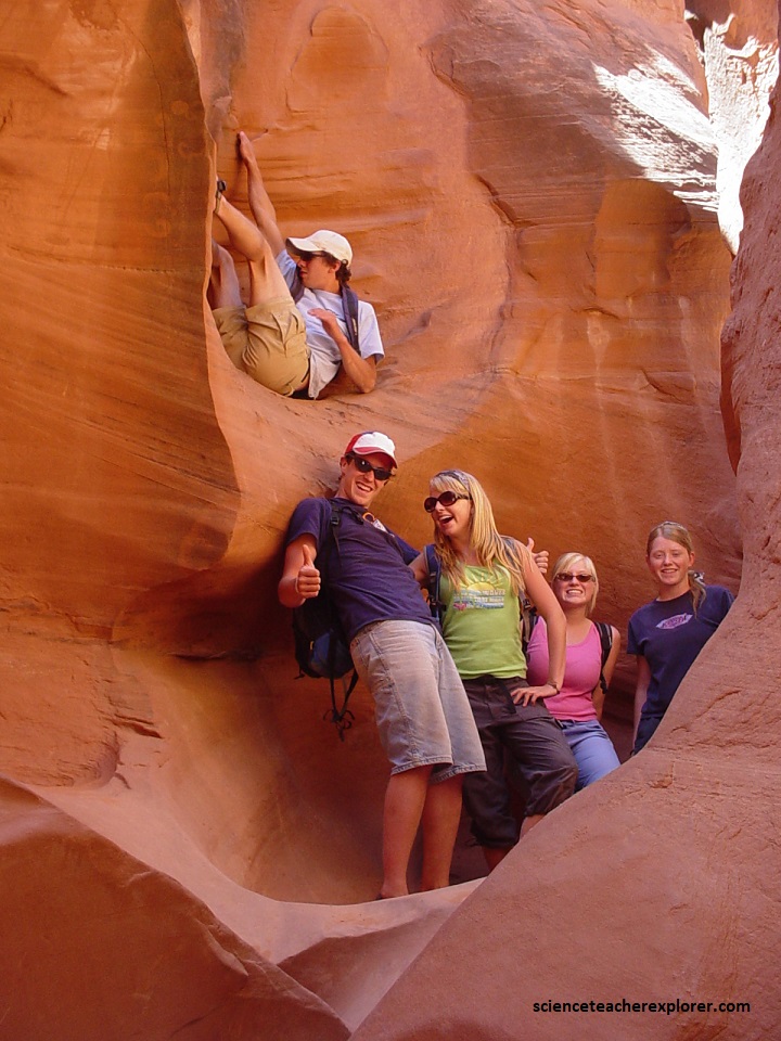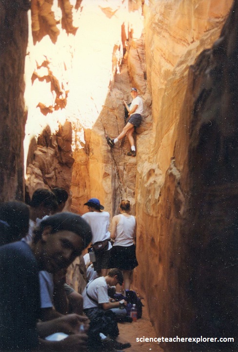 Pictured below, my groups were able to climb all the way up and exit Peek-a-boo Slot. From there we were able to climb over the bench to the east and enter into the upper end of Spooky Slot.