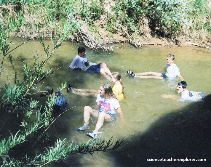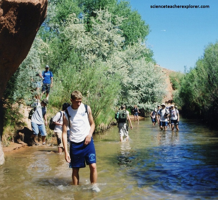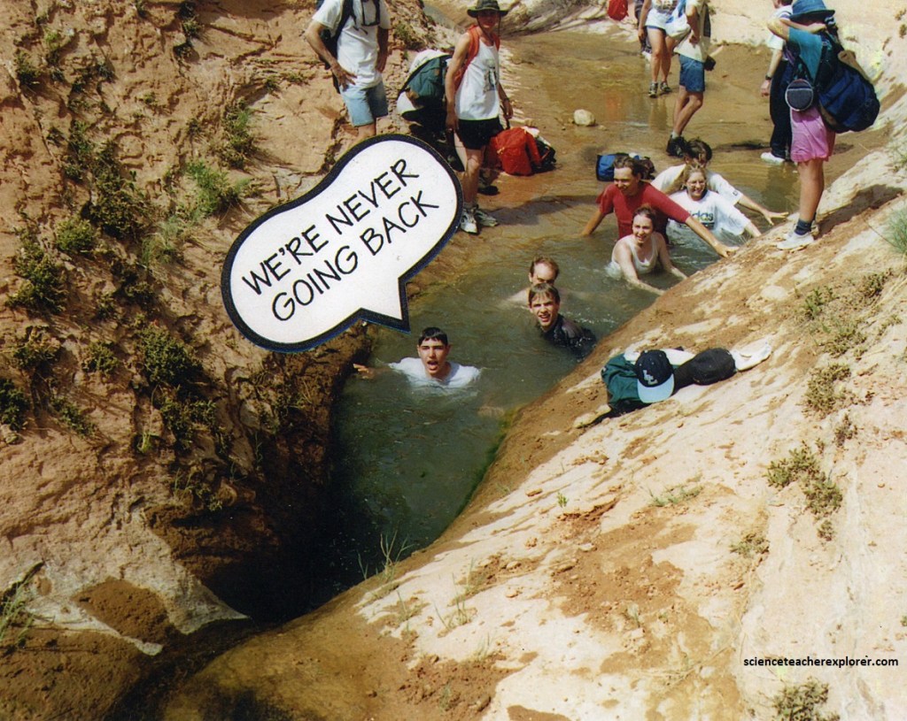 Pictured above, from the Egypt Bench Trailhead parking-lot, we descended into Fence Canyon and onto the Escalante River. Pictured below, the students decided to take a dip in the river.