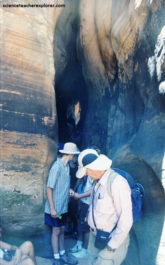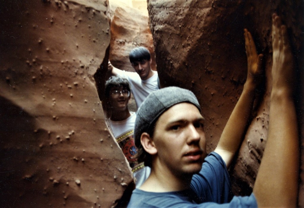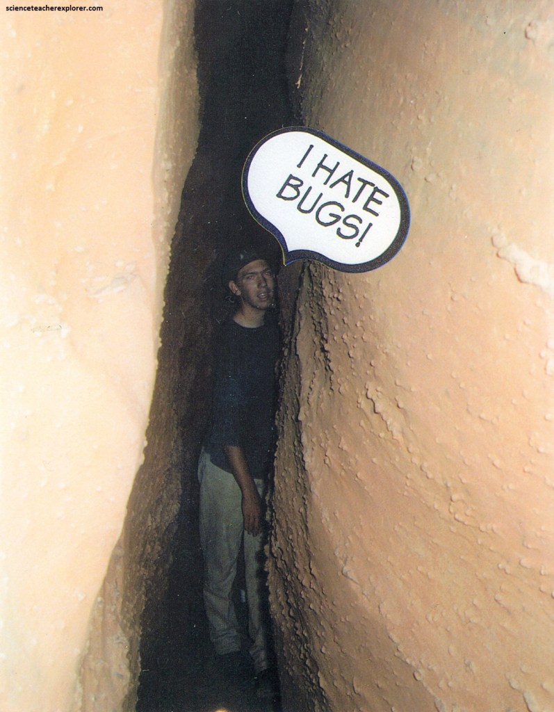 Pictured above, the Navajo sandstone in this canyon seemed to consist of tiny-little concretions embedded in it’s matrix. Concretions are masses of mineral matter embedded within the rock layers, including this sandstone. They often take shape when minerals precipitating (settling) out of water collect around a nucleus, such as a pebble. Additionally, there seem to be an infestation of spiders in this slot during our 1996 expedition (pictured below).