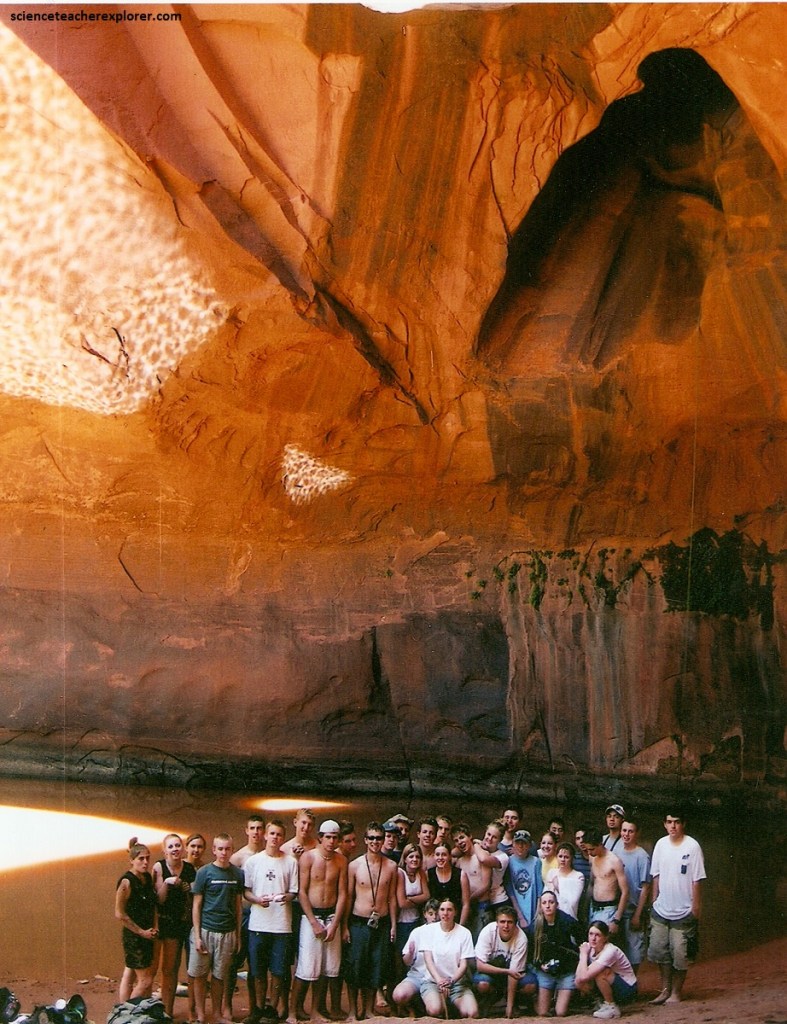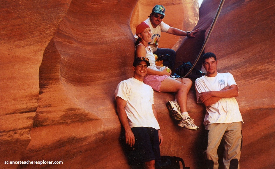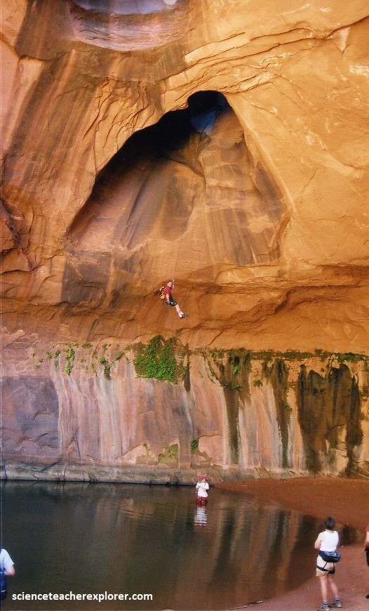 Much of the Escalante River’s course is through sinuous sandstone gorges. The river and the rugged canyons which drain into it form a key section of Grand Staircase-Escalante National Monument. Our group turned into Neon Canyon (east) to view the magnificent Golden Cathedral (pictured below). I climbed above, (with a few of my adult-advisors) Neon Canyon to make a grand entrance by rappelling off the Golden Cathedral into the pool.