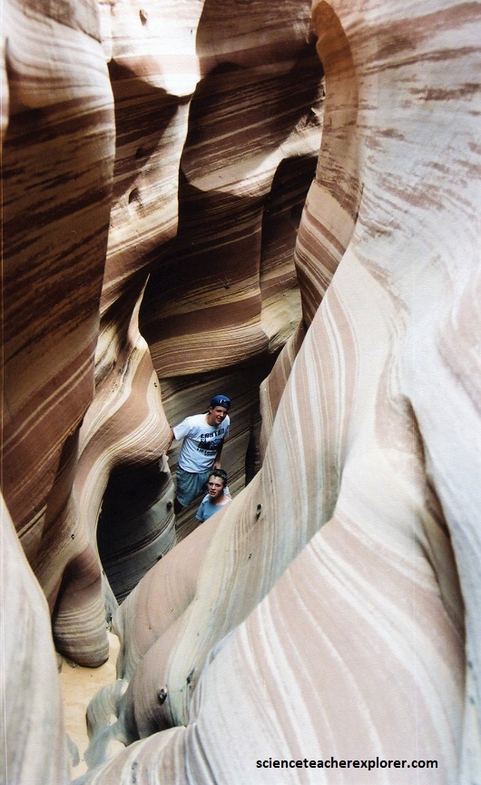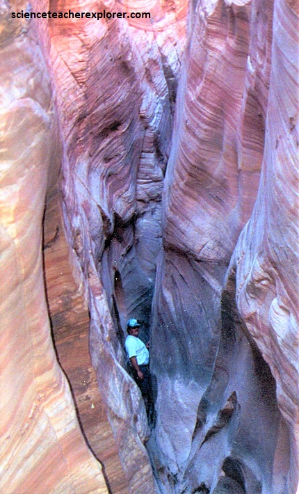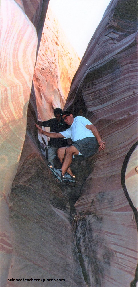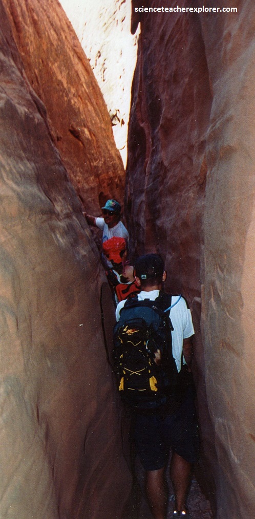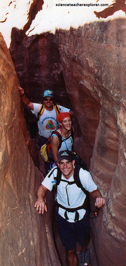 In 2001, I explored the Egypt 3 Slot Canyon with a small group of trekking buddies, (an ex-student and a married couple). Egypt 3 Slot is located between Egypt Bench and Twenty-five Mile Wash. The Egypt Bench access road is 26 km down Hole-in-the-Rock road from Hwy 12. This access road heads northwest for about 16 kms and stops at the Egypt Bench Trailhead. From there we hiked down 1.5 km into the Egypt 3 Slot Canyon.