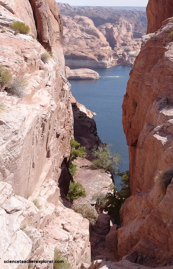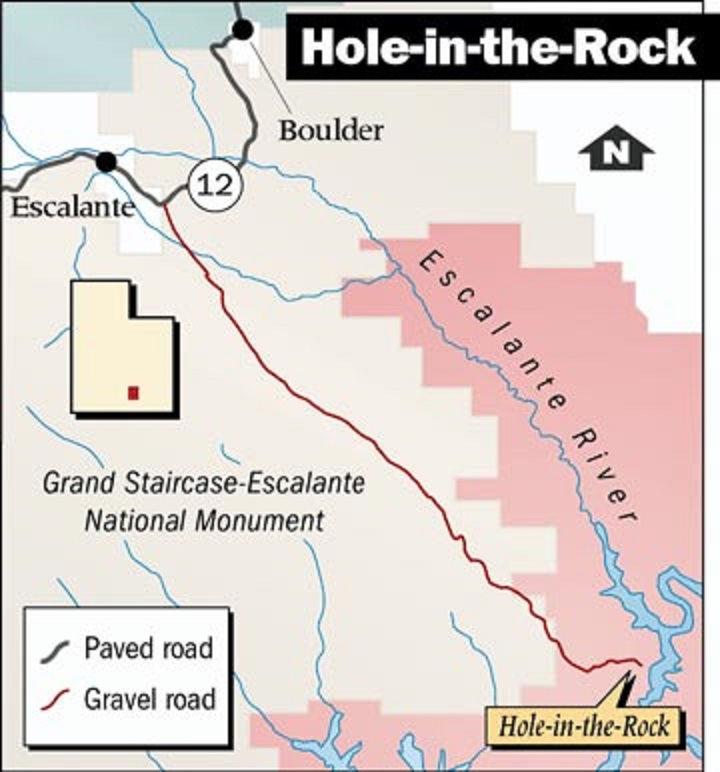 Pictured above, the pioneers, (originally from Parowan, Utah) successfully carved out a route, using a narrow crevice called Hole-in-the-Rock to drop down cliffs 365 m high to reach the Colorado River. By enlarging this natural crack with blasting powder and by chiseling anchor points for ropes into the rock, they managed to move 250 people, 83 wagons, and over 1000 head of livestock down the precipice to the river. A ferry carried the wagons across the water, where the rough route continued to a place now called Bluff, Utah. Today, Lake Powell has encroached on the river crossing that was used.