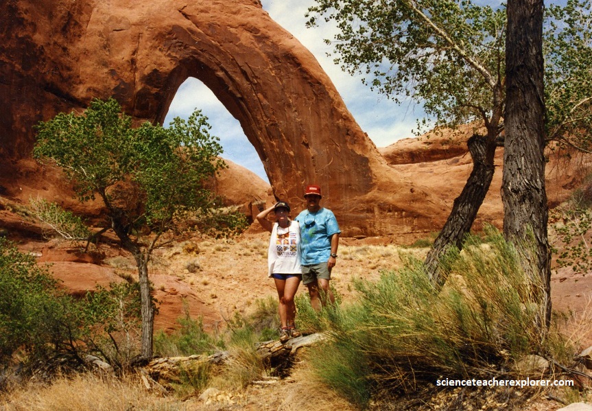 In 1992, I explored Coyote Gulch alone. I drove 57 km down Hole-in-the-Rock road and turned left on a signed dirt-road leading northeast along Forty-mile Ridge. This was the road to Jacob Hamblin Arch Trailhead and a metal tank at 1450 meters. From the metal tank, I walked due north until I reached the canyon overlooking the Jacob Hamblin Arch. I then headed down the slickrock ridge running down to the north just east of the arch. It was a little steep, but I had no problem making it to the bottom. From the bottom I headed east down the canyon. The sandy streambed of Coyote Gulch, typically just a few centimeters deep and provided a path for wading through the trees and vegetation lining the bottom of the canyon. The Jacob Hamblin Arch seemed large enough to reach under an overhang on the opposite side of the canyon.