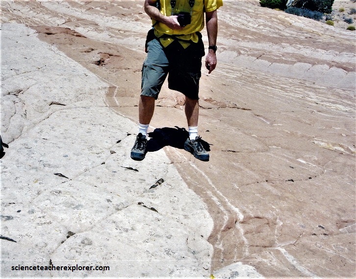 Navajo Sandstone and seen below Stevens Arch, (pictured below). The environment of deposition of the Kayenta Formation is dominantly fluvial, (unlike the eolian Navajo Fm.), but lacustrine and eolian beds are interbedded, notably in the upper part of the unit. In the photo below, I’m standing on the Wingate Sandstone.