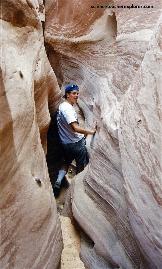 Pictured above, this slot was the narrowest, darkest and coolest slot that I encountered over the years. I was a little too big to fit through standing up, so I ended up crawling the distance. It was slightly wider at the foot level, by a few centimeters.