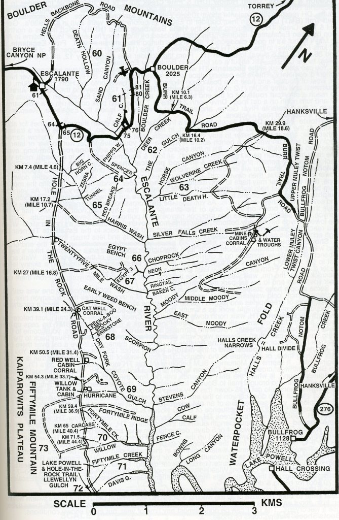 Pictured above, numerous side canyons also feed the main river, accounting for the large size of the basin. From the west, the major tributaries are Harris Wash, Twentyfive Mile Creek (the one I’m in above), Coyote Gulch, Forty-mile Gulch, and Fiftymile Creek, along with the smaller Phipps, Fence, and Scorpion, Davis, Clear, and Indian Creeks. Most of these larger creeks flow from the top of the Kaiparowits Plateau or from the base of its eastern edge, the Straight Cliffs.