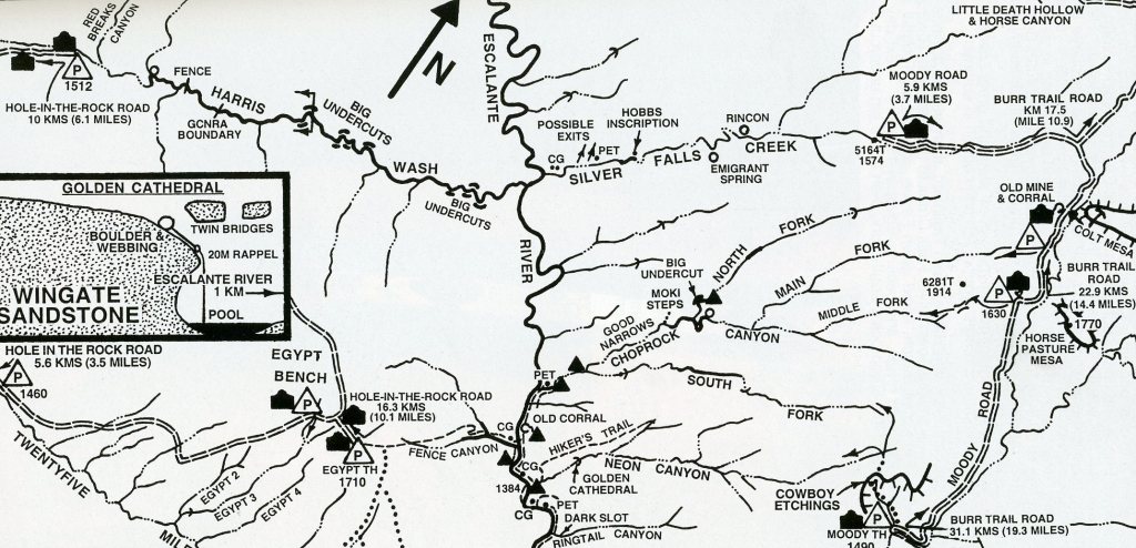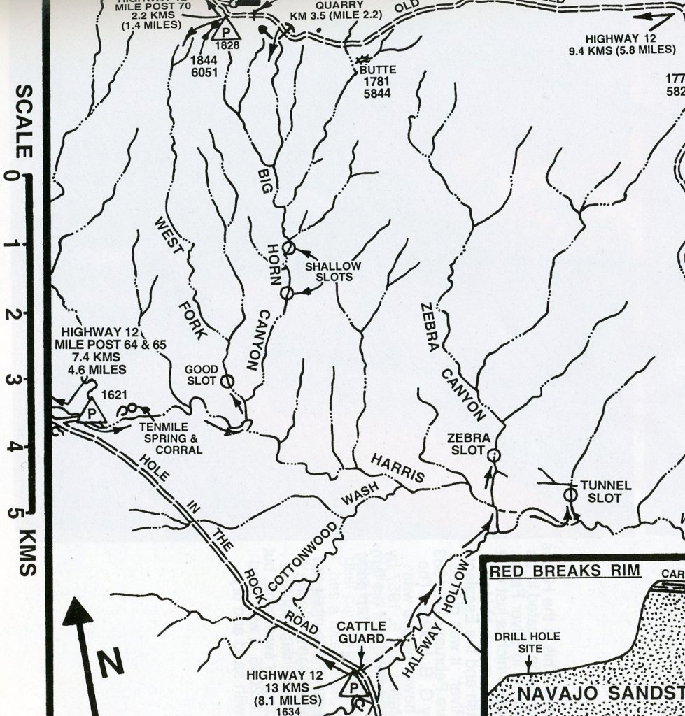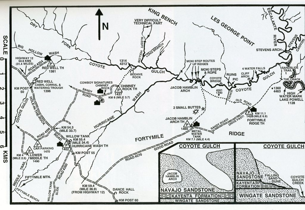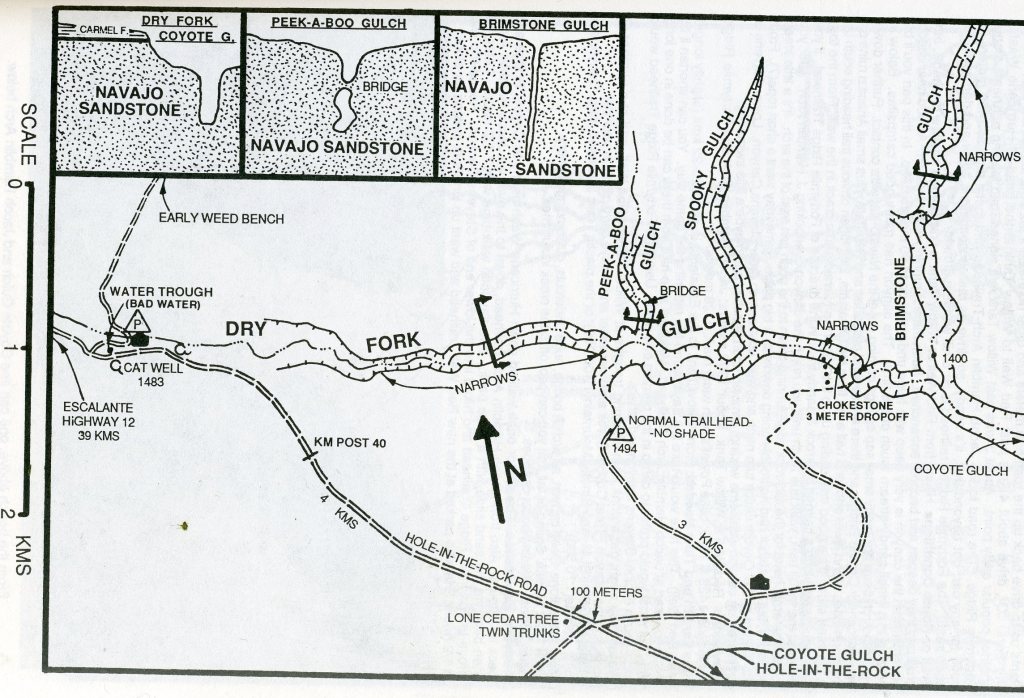In 1996 & 2006, I led another expedition into Dry Fork Gulch to explore “Peek-a-boo and Spooky” side-gulches. These short slot canyons are part of Dry Fork of Coyote Gulch. To approach these canyons we had to drive down Hole-in-the-Rock road for 43 km, where we turned left onto the bench between Coyote Gulch and Hurricane Wash. We had to turn left again after a hundred meters and drive another 3 km to approach the trailhead, (imaged below).