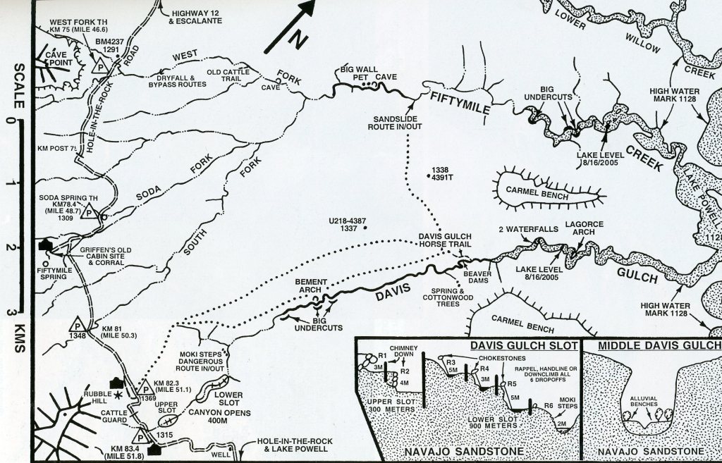 The best way into Davis Gulch is where it crosses the Hole-in-the-Rock road, beyond the northern toe of Fifty-Mile Point. From there, we walked down the main drainage. In about 200 meters, we entered the upper slot, which had 2 drop-offs created by choke-stones. After about another 200 meters of narrows, the canyon opened up for about 300 meters. Next came the lower slot.