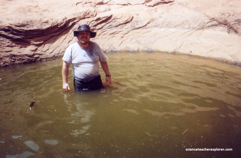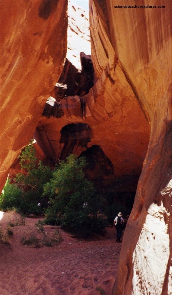 Pictured above, near the bottom of the Davis Gulch Slot, I found a technical way to get out of Davis Gulch. When I was on a reconnaissance trip to Davis Gulch in 2005, I took this route. It was very scary! I wouldn’t recommend it, unless your an expert climber. Further along, our group took a lunch at a 85 meter deep undercut and a year-round stream, (pictured below).