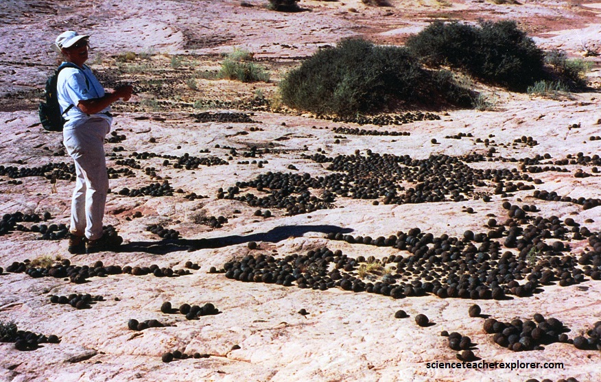 Pictured below, Moqui marbles are particularly common in the Navajo Sandstone. It is believed that these ironstone concretions formed near the water table during deposition as iron-froth-coated air bubbles in water-saturated sand. Moqui marbles are abundant in the Forty-Mile Gulch area in the Escalante Canyons section of the monument.