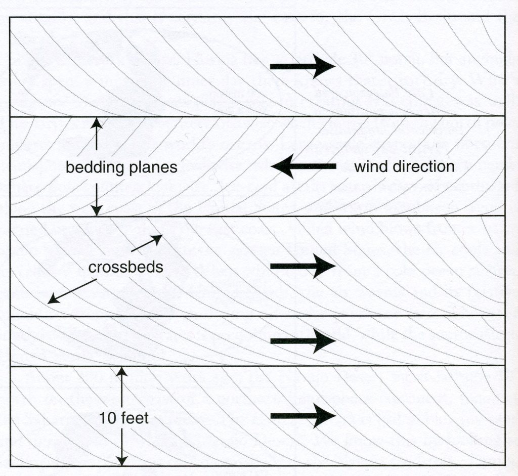 The Navajo Sandstone is formed from ancient sand dunes that lithified over time. Pictured above, cross-bedding is created through the migration of sand dunes. With cross-bedding, the inclined laminations are deposited at the same angle as the migrating face of the dune. This process was repeated several times in order to create the strata featured above.