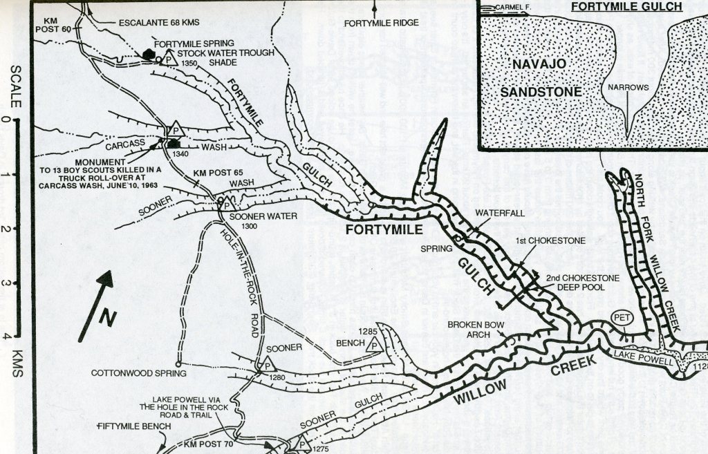 In 1996, I led another educational-expedition of students and leaders into Forty-Mile Gulch. Forty-Mile Gulch and Willow Creek are two canyons located in the lower end of the Escalante River drainage. Access to these canyons are found 62 km on Hole-in-the-Rock road from Hwy. 12. There, my group hiked down Carcass Wash, (east), and Forty-Mile Gulch to the confluence of Willow Creek. Then we hiked up Willow Creek to Sooner Gulch where we met with our vehicles on Hole-in-the-Rock road.