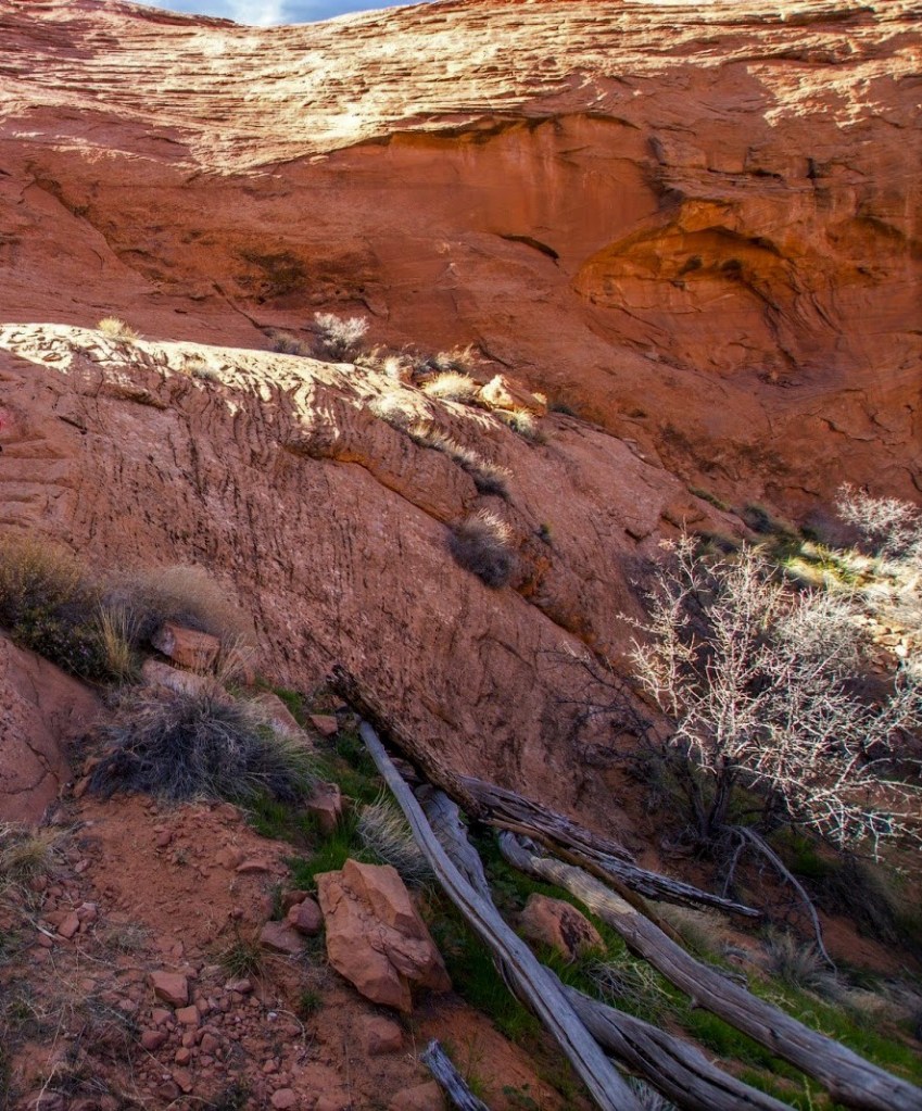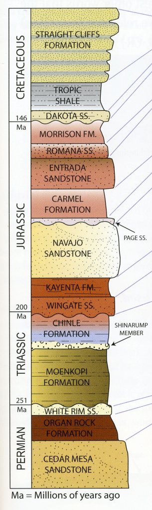 Sandstone exposed in canyons nearer to the Colorado River is typically from the Glen Canyon Group. The dark red cliffs of Coyote & Dry Gulch, for example, are composed of Navajo Sandstone.