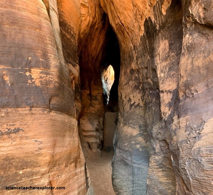 The sandstone layers now exposed in the Canyons of the Escalante were deposited during the Mesozoic era, 180 to 225 million years ago, when this area was part of a large area of sand-dunes. The sandstone that “Tunnel Canyon” cuts through is the Navajo Sandstone, (pictured below).