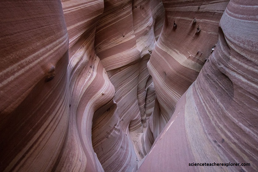 But how does Zebra Slot get its stunning coloring and bands? The answer is iron oxidization and slow sand depositing. Sandstone is made primarily from quartz surrounded by iron oxides. The more iron oxides are present, the more red or pink color in the sand – as it quite literally rusts.