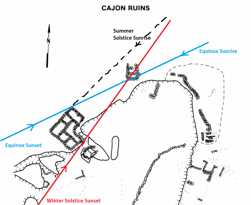 In the far southeastern room of Unit-Type House it is can be seen: At summer solstice, about an hour after sunrise elsewhere in the canyon, the sun finally rises above the massive boulder to the east and streams through the northernmost port to fall on the southwestern corner of the this room. On the winter solstice, the sunbeam falls in the north corner of the interior western wall of the room, next to a small, low wall jutting out from it. The equinox beam lights up a spot midway between this small wall and the southwestern corner.