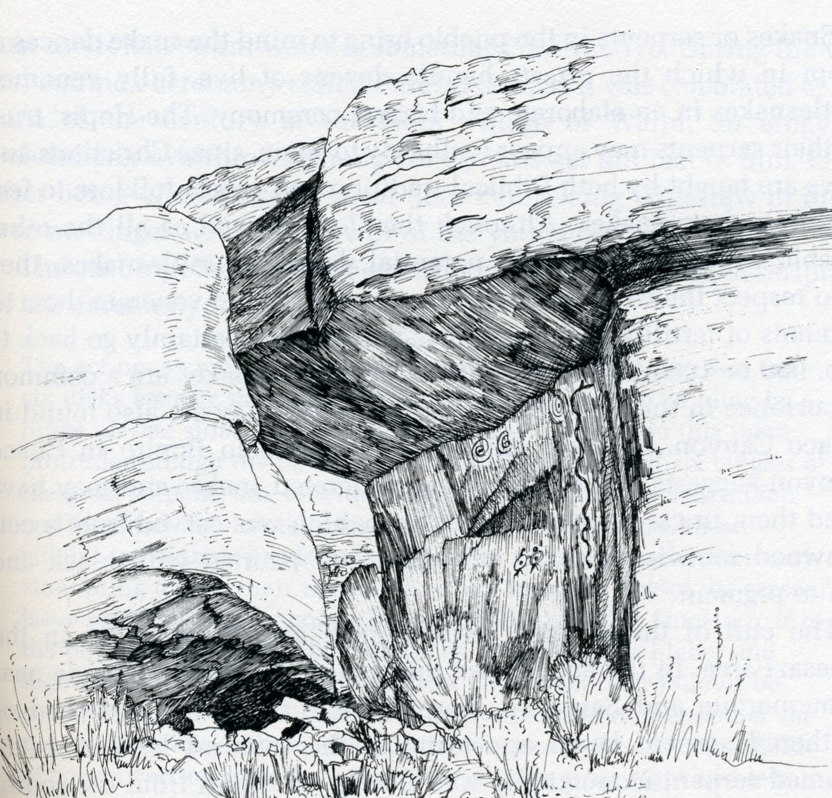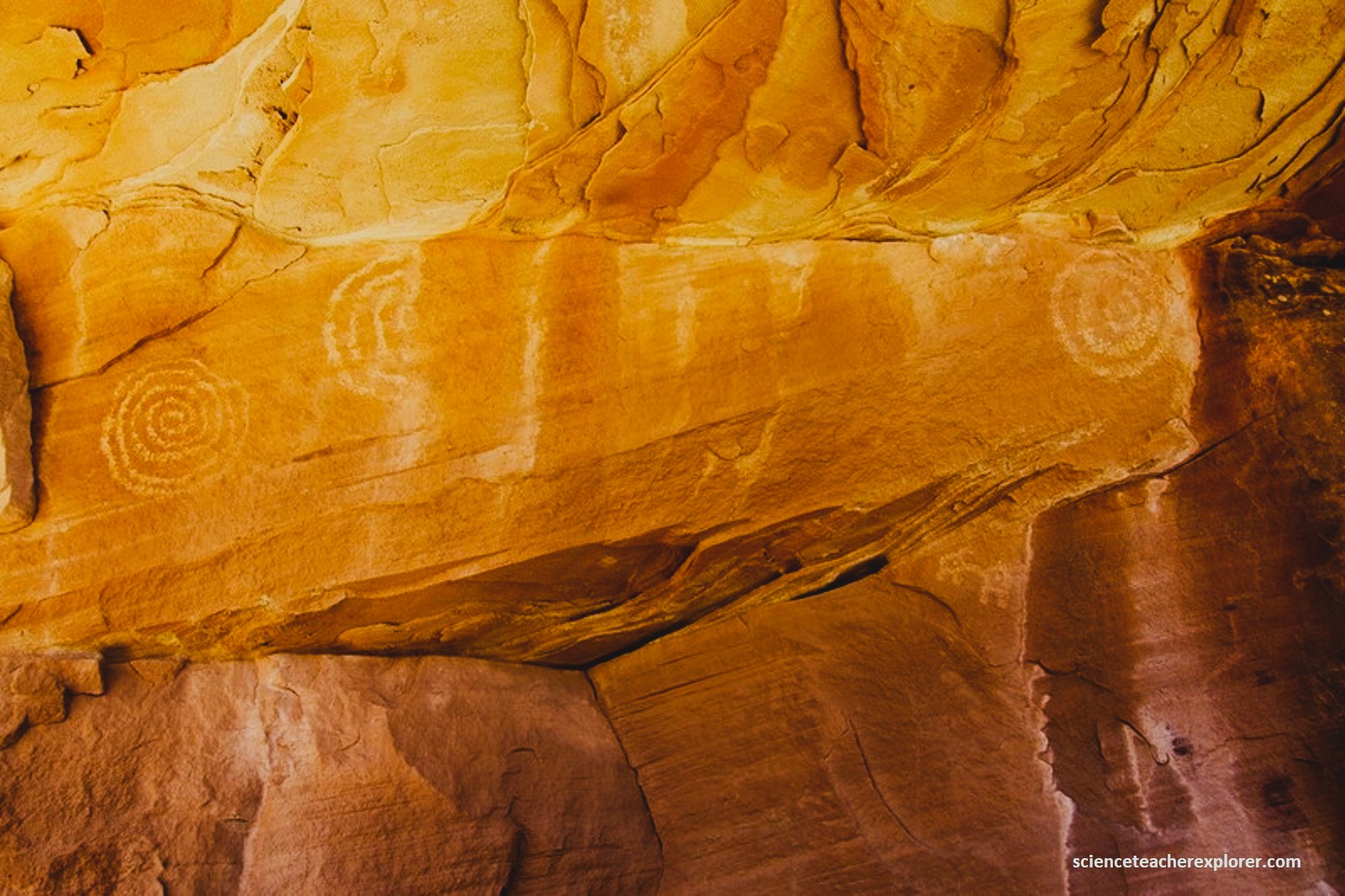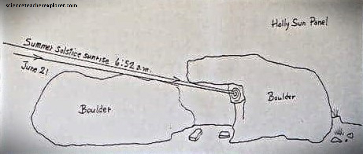 The Holly Solstice Panel, (picture above), uses it’s coincidental location of two large boulders that have fallen away from the canyon wall. On the summer solstice the rising sun shines through a small slit on the upper edges of the boulders allowing a narrow band of light to pass through. This ‘sun dagger’ begins as two beams of light then gradually join one another illuminating the centers of two petroglyphs, (a spiral and a pair of concentric circles), a meter apart. {Note the Sun Dagger time-lapse video by Daniel McVey of this site}.