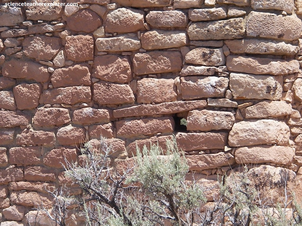 Pictured above, all three of these buildings stood at least two stories tall. A circular tower built on and around several large sandstone boulders on the slope of the west ruin. the builders carefully fitted their masonry blocks to the boulders to produce the desired circular building plan on a remarkably uneven surface.