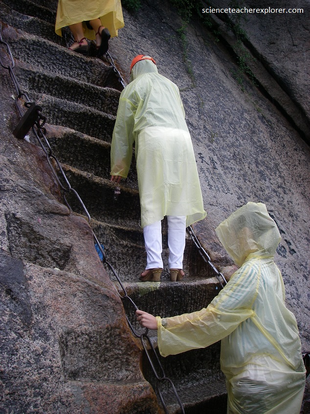 Pictured above, an ancient path, 12 km long, winds fom the bottom to the top by way of sheer cliffs and ledges with hear-stopping drops and breathtaking views. In 2008, it was officially closed to foreigners of European ancestry. Hong Kong and other tourists of Chinese ancestry were allowed. The reason being presumably, is that there have been accidents on the mountain. In some places rock steps have been cut into the vertical granite, and chain hand holds installed, but in cold weather it can be icy and dangerous, thus the discrimination. So, my trekking group was determined to climb the mountain and we started our attempt in the morning darkness, and skirted the gate of the cable car. We started by climbing the initial 3999 steps cut into the granite by way of darkness, (pictured below).