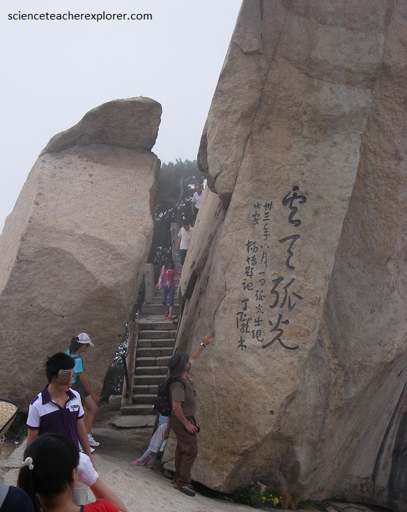 Pictured above, the West Peak is called the Lotus Flower Peak because there is a Taoist Temple there called Cuiyun Palace which has a huge rock in front of it that looks like a lotus flower. There are seven other rocks by Cuiyun Palace that are supposedly the site where the legendary hero Chenxiang ripped the mountain apart to save his mother, the Heavenly Goddess San Sheng Mu, in the folktale “The Magic Lotus Lantern”.