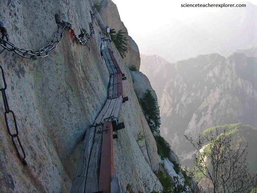 Although Hua Shan takes no climbing expertise to ascend, it is considered the most dangerous hike in the world. To reach the North Peak, stone steps have been carved from the mountain at an impossibly steep incline. Although technically a set of steep stairs, the way up the peak is more akin to a ladder, requiring a slow and deliberate climb. On both sides of the treacherous steps are chains, which are the only safety precaution available to climbers.