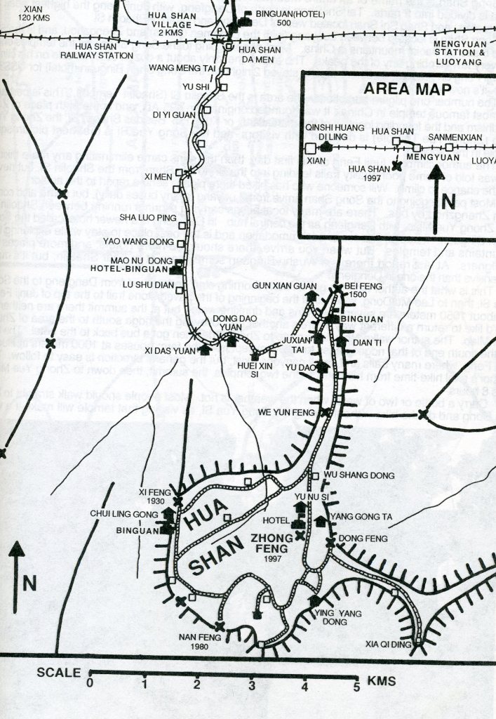 Hua Shan’s height is 2,200 m, but the feature that makes it one of “the five great mountains of China” is its precipitous nature. It’s probably the most beautiful of the five, and in many ways is similar to Huang Shan located in the Anhui Province.