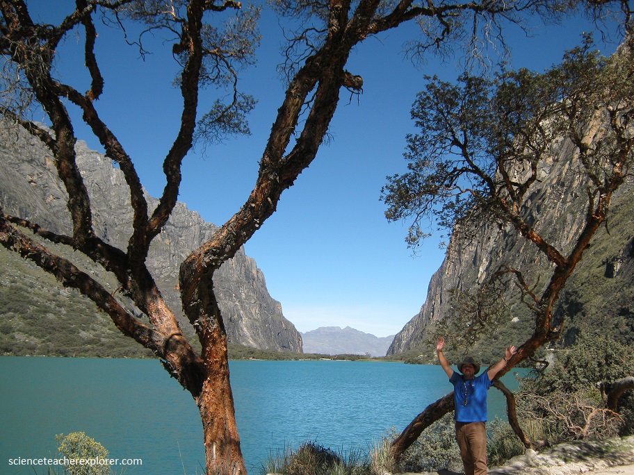 The dirt road from Yungay passes the Llanganuco Lagoon (pictured below) en route to Portachuelo, a high pass at 4,767 meters, and leads to the village of Vaquería. The turquoise-green color waters run in 910 meters long, 368 meters wide and 7 meters deep. The Llanganuco Lagoon was formed due to melting of glaciers Huascaran, Huandoy, Pisco, Chopicalqui and Yanapaccha, with the water temperatures averaging 7 ° C on the surface. I’m standing near a Buddleja Tree. The Buddleja coriacea is a variable species endemic to the high Andes of the Cordillera Blanca. It grows on dry to semi-humid rocky soils at elevations of 3,000–4,350 m. These are high-altitude Andean trees with orange flaky bark and twisted limbs.