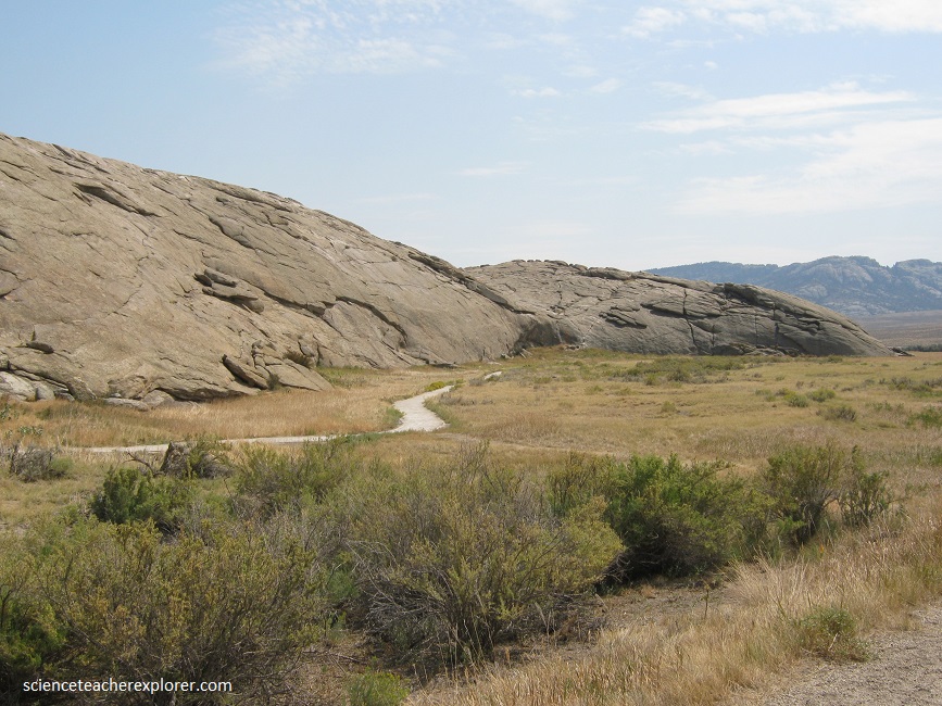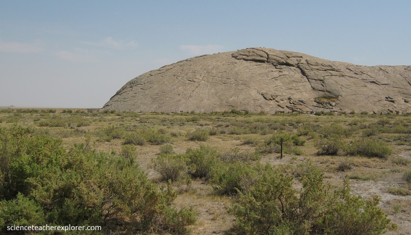 Independence Rock is what geologists call a “pluton:” a big body of igneous rock (in this case, a granite that is over one billion years old) that cooled slowly under the surface of the earth and then was slowly exposed by erosion of the surface layers. The rock is ancient even by geologic standards: more than 2.6 billion years old, (more than half the age of the Earth itself). It is part of the Sweetwater Hills, which stretch west for 80 kilometers along the course of the Sweetwater River. This granite belongs to a 2.6 billion year old basement rock that belong to large portions of the Laramie Range, Wind River Range, and other Wyoming mountains. Close up, the granite is a dazzling array of quartz, plagioclase, orthoclase, and mica minerals. Marble-sized phenocrysts of plagioclase feldspar poke up brusquely from the surface, standing high while the surrounding matrix crumbles away.