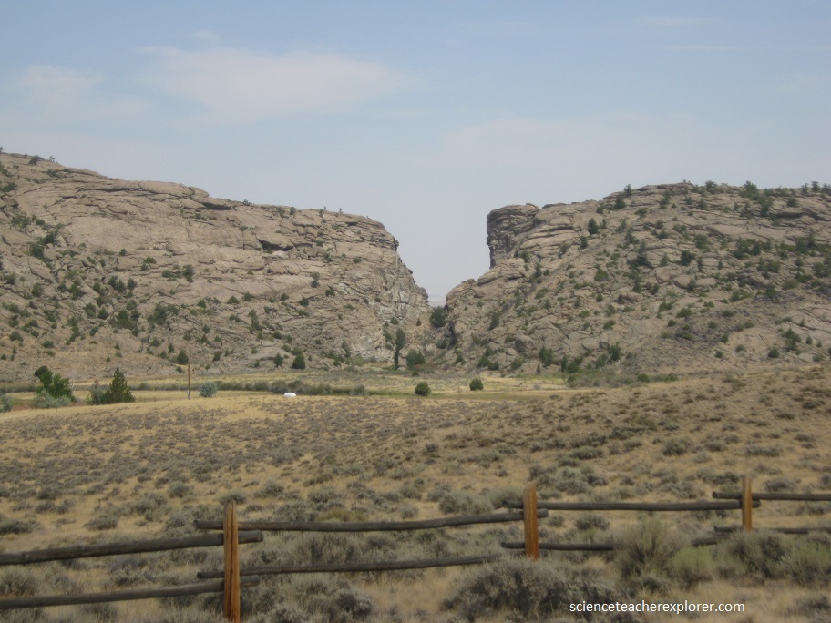 Ten kilometers southwest of Independence Rock, emigrants on the Oregon/California/Mormon trail, encountered another major trail landmark: Devil’s Gate. Here, the Sweetwater River has carved a narrow cleft in the granite that is about 123 m deep and 500 m long. The cleft is 10 m wide at the base but nearly 100 m wide at its top.