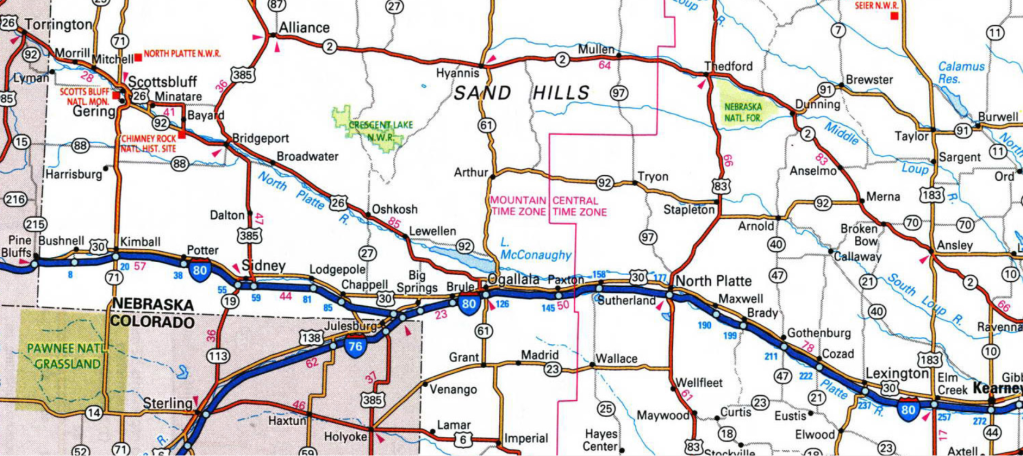 US 26 descends through Ash Hollow, then crosses the North Plate River floodplain, (pictured above). Continuing northwest, cross over the North Platte River, which parallels US 26 as the road heads westward across the prairie. (Nourished by snowmelt from the Colorado Rockies, the 1,0711 km long river merges with it’s smaller sibling, the South Platte, to form the main-stem Platte River in central Nebraska.)
